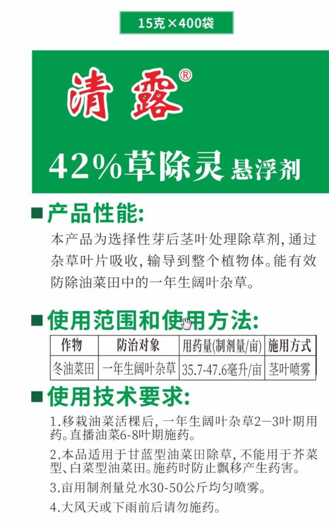 [使用技術(shù)要求]1.移栽油菜活棵后,一年生闊葉雜草2-3葉期用藥。直播油菜6-8葉期施藥。2.本品適用于甘藍型油菜田除草,不能用于芥菜型、白菜型油菜田。施藥時防止飄移產(chǎn)生藥害。3.畝用制劑量兌水30—50公斤均勻噴霧。4.大風(fēng)天或下雨前后請勿施藥。5.油菜每個生產(chǎn)周期最多使用1次。